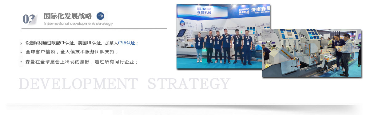 “森曼機(jī)械”作為全球門窗設(shè)備供應(yīng)商,本著"seaman"精神,勇立潮頭,拼搏創(chuàng)新,以爭(zhēng)做行業(yè)為目標(biāo),在行業(yè)前輩發(fā)展的基礎(chǔ)上,努力學(xué)習(xí),積極進(jìn)取。目前公司產(chǎn)品涵蓋塑料門窗設(shè)備、鋁合金門窗設(shè)備、鋁幕墻設(shè)備、鋁木復(fù)合門窗設(shè)備及中空玻璃設(shè)備五大種類,近百個(gè)品種。公司產(chǎn)品銷售至全國各地及東南亞、非洲、東歐、北美等幾十個(gè)國家和地區(qū)。在這個(gè)競(jìng)爭(zhēng)激烈的年代,我們正努力使我們的產(chǎn)品!